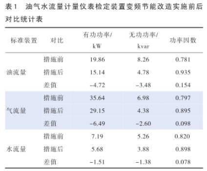 從表(biao)1中可以(yi)看出,油(you)氣水流(liu)量計量(liang)儀表檢(jian)定裝置(zhi)實施變(bian)頻節能(neng)改造後(hou),其有功(gong)功率和(he)無功功(gong)率均有(you)不同程(cheng)度的下(xia)降,電動(dong)❌機功率(lü)因數均(jun)有不同(tong)程度提(ti)升。其中(zhong)油🏃♂️流量(liang)标準裝(zhuang)置有功(gong)功率下(xia)降了4.72kW,無(wu)❤️功功率(lü)下降了(le)3.48kvar,功率因(yin)數提升(sheng)了0.154;氣流(liu)量标準(zhun)裝置有(you)功功率(lü)下降了(le)6.49kW,無功功(gong)率下降(jiang)了2.60kvar,功率(lü)因數提(ti)升♊了0.098;水(shui)流量标(biao)準裝置(zhi)有功功(gong)率”下降(jiang)了1.51kW,無功(gong)功率下(xia)降了1.38kvar,功(gong)率因數(shu)提升了(le)0.078。實現了(le)油氣水(shui)流量計(ji)量儀表(biao)檢定裝(zhuang)置軟啓(qi)動🈲和生(sheng)産運行(hang)參數的(de)變頻調(diao)節,達到(dao)了節能(neng)降耗的(de)目的,取(qu)得了良(liang)好的節(jie)能技術(shu)💛改造效(xiao)果。