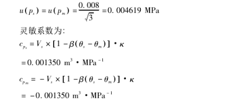 檢測(ce)液體爲(wei)清潔水(shui),由于試(shi)驗時的(de)水壓的(de)最大變(bian)化量不(bu)超過0.2MPa。經(jing)查相關(guan)手冊,可(ke)得檢測(ce)液體的(de)體積壓(ya)縮系數(shu)的變化(hua)量±9x10-5MPa-1。按均(jun)勻分布(bu)計算,則(ze):