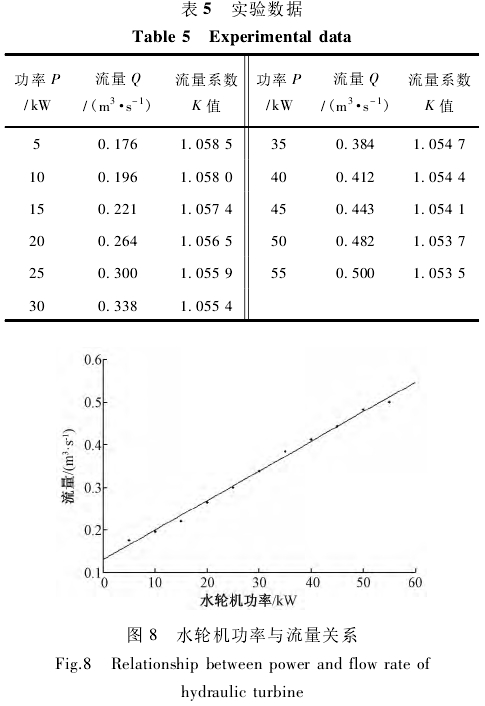 通(tong)過效(xiao)率試(shi)驗測(ce)得相(xiang)關數(shu)據,在(zai)實驗(yan)中改(gai)變出(chu)力🈚P來(lai)⛷️測流(liu)✂️量Q,并(bing)根據(ju)上述(shu)分析(xi)得到(dao)了流(liu)量系(xi)數K值(zhi),數據(ju)如表(biao)5所示(shi),水🏃♂️輪(lun)機功(gong)率🔱與(yu)流量(liang)的關(guan)系如(ru)圖8所(suo)示。