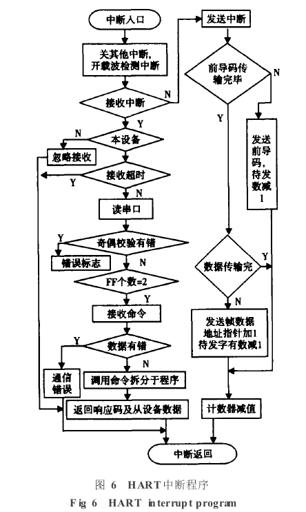 在HART通信中(zhong),智能電磁(ci)流量計作(zuo)爲從設備(bei).進行通訊(xun),所以這裏(li)的軟件設(she)計隻是針(zhen)對于從設(she)備.HART通信采(cai)用水💔平和(he)垂直校驗(yan)的方⛱️法.當(dang)檢測到接(jie)收數據有(you)差錯時,則(ze)等到主設(she)備命令幀(zhen)發完後,通(tong)知主設備(bei)數據接收(shou)有誤.主設(she)備則重新(xin)發命令幀(zhen)🚶,從而保證(zheng)通信的正(zheng)确可靠.HART中(zhong)斷子程序(xu)流程圖如(ru)圖6所示.