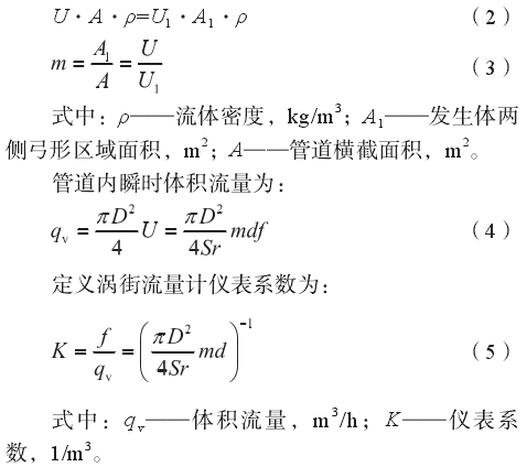 式(shi)中:ƒ一旋渦(wo)分離頻率(lü),Hz;Sr-斯特勞哈(ha)爾數;U1一發(fa)生體兩側(ce)流體平均(jun)🌂流速,m/s;U一管(guan)道來流平(ping)均流速,m/s;m一(yi)發生體兩(liang)側弓形流(liu)通面積💋與(yu)管道橫截(jie)面積之比(bi)。