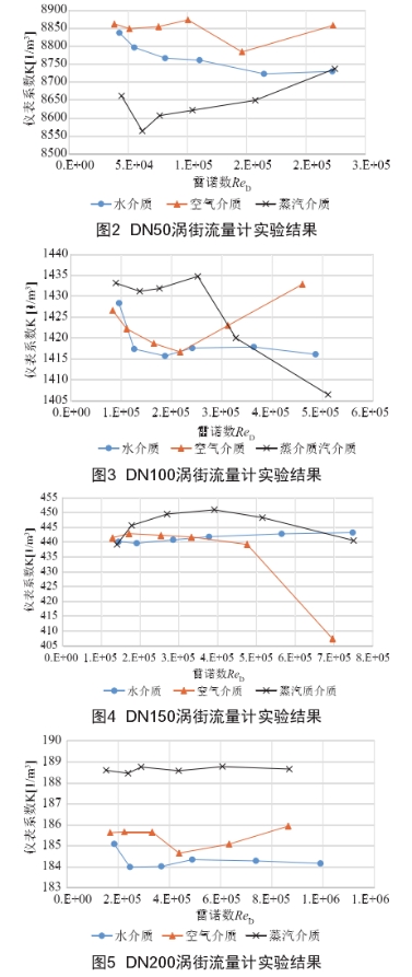 按照2.3中的(de)實驗方案(an)對四台不(bu)同口徑的(de)渦街流.量(liang)計在水、空(kong)氣、蒸汽三(san)種介質下(xia)進行儀表(biao)系數實流(liu)标定實驗(yan),實驗結果(guo)如圖2~5所示(shi)。