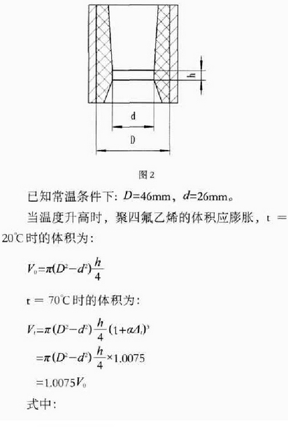 爲了保(bao)持聚四(si)氟乙烯(xi)零件尺(chi)寸的穩(wen)定性,規(gui)定其🔴溫(wen)度應用(yong)🔞範圍是(shi)70℃以下。在(zai)試制的(de)初始階(jie)段,用常(chang)規加工(gong)方法,即(ji)按圖紙(zhi)尺寸進(jin)行錐管(guan)和浮子(zi)的加工(gong)👌,可以發(fa)🈲現,在常(chang)溫下工(gong)作正常(chang)的浮子(zi)在高溫(wen)試驗中(zhong)出現了(le)💋卡死現(xian)象,反複(fu)的試驗(yan)都得到(dao)🈲同樣的(de)結✂️果。實(shi)際測量(liang)表明:浮(fu)子尺寸(cun)變化不(bu)大,因此(ci)推斷是(shi)由于錐(zhui)管尺寸(cun)👌的變化(hua)引起卡(ka)死現象(xiang)。通過理(li)論計算(suan),得出結(jie)論,以利(li)改進。