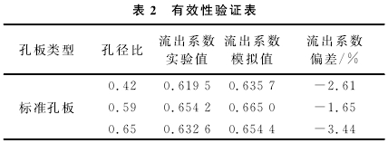 基于(yu)流體相(xiang)似原理(li),可利用(yong)Fluent計算在(zai)計量管(guan)内徑爲(wei)30mm,孔徑比(bi)爲0.42、0.59、0.65條件(jian)下水的(de)流出系(xi)數,與實(shi)驗值進(jin)行對比(bi),對本研(yan)究模型(xing)有效性(xing)進行驗(yan)證。驗證(zheng)結果如(ru)表2所列(lie)。