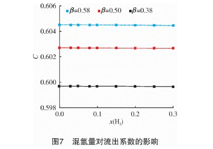 采用式(shi)(2)計算得(de)到不同(tong)混氫量(liang)下的流(liu)出系數(shu),計算結(jie)果㊙️見圖(tu)7。從🐕圖7可(ke)以看出(chu):孔徑比(bi)越大,流(liu)出系數(shu)越大;在(zai)混氫量(liang)小于0.3時(shi)🌐,混氫量(liang)的變化(hua)幾乎不(bu)會對流(liu)出系數(shu)産生影(ying)響。
