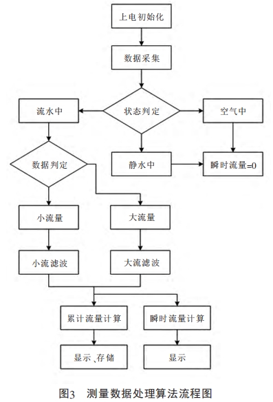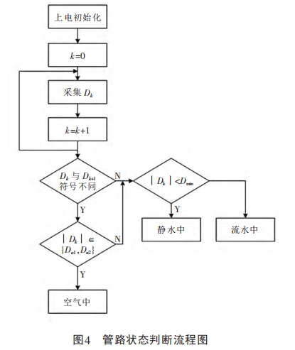 圖(tu)3所示的(de)流程爲(wei)測量系(xi)統采樣(yang)數據的(de)處理過(guo)程,因🈲此(ci)未涉及(ji)勵磁、通(tong)信等功(gong)能模塊(kuai)。系統對(dui)采集的(de)原始數(shu)據進行(hang)判斷,區(qu)分電極(ji)處于空(kong)氣、靜水(shui)或流水(shui)等三種(zhong)不同狀(zhuang)态,如圖(tu)4所示。