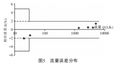 經(jing)過上述(shu)測量方(fang)法與數(shu)據處理(li)後的DN20管(guan)徑試驗(yan)樣機測(ce)量結🙇♀️果(guo)👈如表1所(suo)示。從表(biao)中可以(yi)看出,在(zai)常用流(liu)🚶♀️量Q3(4000L/h)内,流(liu)量🥰傳感(gan)器具有(you)很好的(de)流量特(te)性,在R200範(fan)圍内相(xiang)對誤差(cha)≤2%,在R160範圍(wei)内相對(dui)誤差≤1%。其(qi)流量誤(wu)差分布(bu)如圖5所(suo)示,在全(quan)流量範(fan)🚶圍内,測(ce)量❗誤差(cha)全部在(zai)MPE(最大允(yun)許誤差(cha))内。