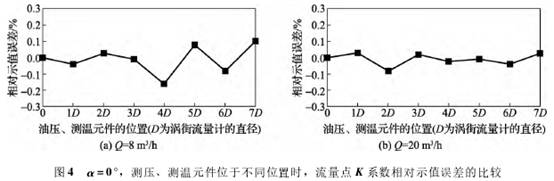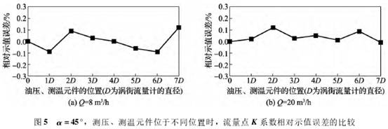 當α增加(jia)至45°,流量(liang)點Q=8m3/h,模拟(ni)元件位(wei)于不同(tong)位置時(shi),K系數的(de)相對示(shi)值誤差(cha)位于±0.1%之(zhi)間,表示(shi)模拟元(yuan)件放置(zhi)不同位(wei)置,可以(yi)導緻K系(xi)數變大(da)或變小(xiao)(圖5(a))。在大(da)流量情(qing)況下(Q=20m3/h),從(cong)🈚圖5(b)中,可(ke)以發現(xian)K系數幾(ji)乎都是(shi)比實際(ji)值變大(da)的,且變(bian)化幅度(du)基本位(wei)于0%~0.1%範圍(wei)。