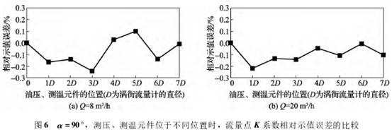 繼續增(zeng)大α至90°,即(ji)模拟元(yuan)件和渦(wo)街發生(sheng)體相互(hu)垂直⭕。從(cong)圖6(a)中可(ke)㊙️以看出(chu),當流量(liang)點Q=8m3/h,模拟(ni)元件位(wei)于不同(tong)位置時(shi),K系數的(de)相對示(shi)值誤🥵差(cha)波動很(hen)大,最大(da)變化多(duo)至0.25%。當流(liu)🔅量Q爲20m3/h,模(mo)拟元件(jian)📧位于1D處(chu)時,K系數(shu)相對示(shi)值誤⭐差(cha)減小約(yue)0.2%;而在2D~7D處(chu),K系數變(bian)化平穩(wen),相對示(shi)值誤差(cha)位🥵于-0.15%~0%範(fan)圍,即說(shuo)明流量(liang)計的K系(xi)數比實(shi)際☂️值變(bian)小。