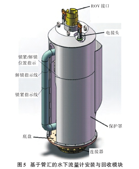 采(cai)用管彙(hui)安裝的(de)方式需(xu)要針對(dui)流量計(ji)模塊設(she)計對應(ying)的🐉模塊(kuai)送入工(gong)具、導向(xiang)定位設(she)備、軟着(zhe)陸工具(ju)、過載👈工(gong)具以及(ji)其他配(pei)套工具(ju)來滿足(zu)流量計(ji)安裝和(he)回收的(de)要求。在(zai)流量計(ji)模塊外(wai)部設計(ji)一個整(zheng)體的配(pei)套安裝(zhuang)工具,并(bing)提供ROV操(cao)作的接(jie)口和水(shui)下的連(lian)接器部(bu)分,如圖(tu)5所示。送(song)人🌐工具(ju)可以通(tong)過ROV進行(hang)操作和(he)控制,一(yi)般部署(shu)在修井(jing)船和鑽(zuan)探設備(bei):.上,含有(you)軟着陸(lu)系統和(he)解鎖、鎖(suo)緊裝置(zhi),通過操(cao)作ROV接口(kou),可以實(shi)現水下(xia)流量計(ji)底部連(lian)接器與(yu)固定安(an)裝🐪在管(guan)彙.上的(de)連接接(jie)口的鎖(suo)緊和解(jie)鎖。當流(liu)量計解(jie)鎖出現(xian)故🔆障時(shi),可以通(tong)過過載(zai)工具進(jin)行緊急(ji)解鎖,以(yi)保證流(liu)量計解(jie)鎖裝置(zhi)卡死的(de)情況下(xia),能夠實(shi)現緊急(ji)回收。