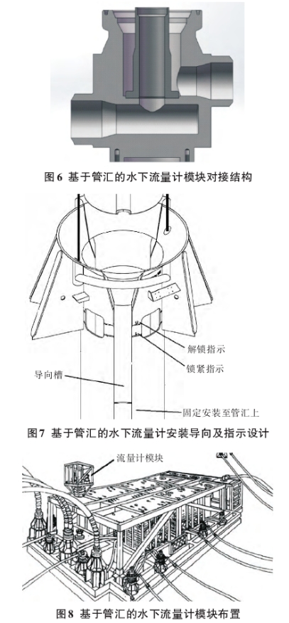 同(tong)時在管(guan)彙,上設(she)計對應(ying)的水下(xia)安裝所(suo)需連接(jie)結構、導(dao)向及指(zhi)示設計(ji)、模塊布(bu)置等,如(ru)圖6、圖7、圖(tu)8所示,通(tong)過專門(men)的✏️工具(ju)實現流(liu)量計模(mo)塊的獨(du)立整體(ti)安裝和(he)回收📧。其(qi)中,連🆚接(jie)結構與(yu)流量計(ji)下部的(de)連接器(qi)相❌連,導(dao)向結構(gou)用于流(liu)量計下(xia)放❓安裝(zhuang)過程💰中(zhong)的導向(xiang)👌與定位(wei),通過指(zhi)示設計(ji)可👣以确(que)認流量(liang)計定位(wei)是否🐆正(zheng)确,以及(ji)解鎖和(he)鎖緊操(cao)作是否(fou)完成。