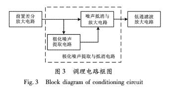 根(gen)據前饋控(kong)制的自适(shi)應極化噪(zao)聲抵消原(yuan)理,設計了(le)信号調理(li)🍓電路2,以實(shi)現極化噪(zao)聲的濾除(chu)。信号調理(li)電路2主要(yao)包⭐括前置(zhi)差分放大(da)電路、極化(hua)噪聲提取(qu)與抵消電(dian)路、低通濾(lü)波放大電(dian)路三部分(fen)。調理電路(lu)如圖3所示(shi)。