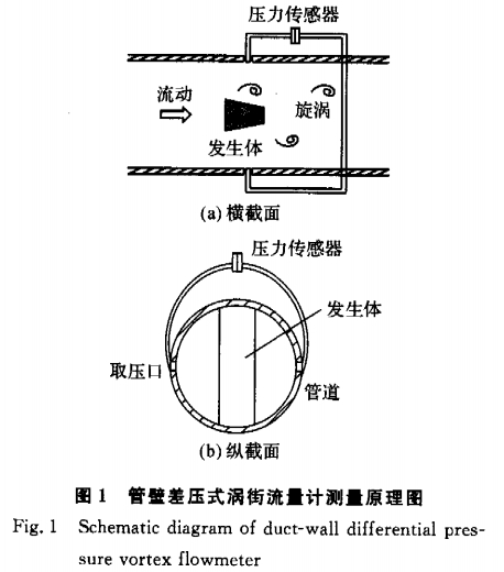 在(zai)渦街(jie)流量(liang)計中(zhong),有旋(xuan)渦産(chan)生的(de)地方(fang)必有(you)壓力(li)的變(bian)化,交(jiao)替産(chan)生的(de)旋渦(wo)必然(ran)會導(dao)緻附(fu)近流(liu)場的(de)壓力(li)出現(xian)規則(ze)的變(bian)化,其(qi)變化(hua)的頻(pin)率與(yu)旋渦(wo)的頻(pin)率一(yi)一對(dui)應,因(yin)此可(ke)以通(tong)過檢(jian)測發(fa)生體(ti)尾流(liu)中某(mou)确定(ding)的兩(liang)點間(jian)的波(bo)動差(cha)壓來(lai)測量(liang)旋渦(wo)頻率(lü),從而(er)實現(xian)流量(liang)的測(ce)量.由(you)于發(fa)生體(ti)兩側(ce)對稱(cheng)點上(shang)的相(xiang)位差(cha)爲180°,且(qie)振動(dong)幅度(du)和頻(pin)率相(xiang)等,因(yin)此将(jiang)差壓(ya)取壓(ya)位置(zhi)選取(qu)在管(guan)壁上(shang)的對(dui)稱點(dian)更利(li)于檢(jian)測,如(ru)圖1所(suo)示,其(qi)中圖(tu)1(a)、(b)分别(bie)爲沿(yan)着管(guan)道軸(zhou)向和(he)徑向(xiang)的截(jie)面圖(tu).