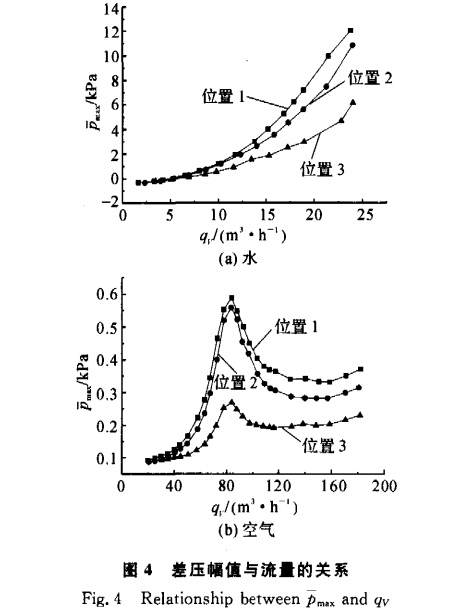 式(shi)中:Pmax.pmin,;分(fen)别爲(wei)第i個(ge)旋渦(wo)周期(qi)内管(guan)壁差(cha)壓的(de)最大(da)值和(he)最小(xiao)值;N爲(wei)檢測(ce)的總(zong)周期(qi)數. `Pmx值(zhi)反映(ying)了旋(xuan)渦強(qiang)度的(de)大小(xiao),應随(sui)流量(liang)的增(zeng)加而(er)增大(da).實驗(yan)`Pmx與qv的(de)關系(xi)如圖(tu)4所示(shi),當圖(tu)4(a)中給(gei)出的(de)是流(liu)動介(jie)質爲(wei)水時(shi),從3對(dui)不同(tong)取壓(ya)位置(zhi)測量(liang)的`Pmx随(sui)qv的分(fen)布情(qing)況,可(ke)見3條(tiao)曲線(xian)均随(sui)qv的增(zeng)加而(er)單調(diao)遞增(zeng),較好(hao)地符(fu)合了(le)理論(lun)預測(ce);圖4(b)中(zhong)所示(shi)的是(shi)流動(dong)介質(zhi)爲空(kong)氣時(shi)的情(qing)況,3條(tiao)曲線(xian)的形(xing)狀相(xiang)似,當(dang)qv<83m3/h,`Pmx随流(liu)量的(de)增加(jia)而增(zeng)大,在(zai)qv=83m3/h附近(jin)取得(de)極大(da)值,當(dang)qv>83m3/h,`Pmx不再(zai)随流(liu)量的(de)增加(jia)而增(zeng)大,而(er)是急(ji)劇下(xia)降直(zhi)至qv>120m3/h後(hou)逐漸(jian)平緩(huan)遞增(zeng).