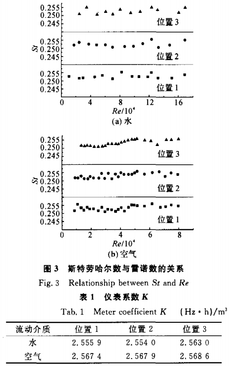 因此(ci)要求(qiu)在一(yi)定的(de)雷諾(nuo)數Re範(fan)圍内(nei)St保持(chi)不變(bian).不同(tong)流動(dong)介質(zhi)、不同(tong)取壓(ya)位置(zhi)的St與(yu)Re的對(dui)應關(guan)系如(ru)圖3(a)、(b)所(suo)示.各(ge)種情(qing)況的(de)St基本(ben)上保(bao)持爲(wei)常數(shu),且它(ta)們的(de)值均(jun)相等(deng),約爲(wei)0.253.各種(zhong)情況(kuang)的儀(yi)表系(xi)數列(lie)于表(biao)1,它們(men)之間(jian)的最(zui)大相(xiang)對誤(wu)差小(xiao)于1%,這(zhe)表明(ming)在旋(xuan)渦發(fa)生體(ti)後一(yi)定的(de)距離(li)内,流(liu)動介(jie)質和(he)取壓(ya)位置(zhi)對管(guan)壁差(cha)壓式(shi)渦街(jie)流量(liang)計的(de)測量(liang)影響(xiang)很小(xiao).