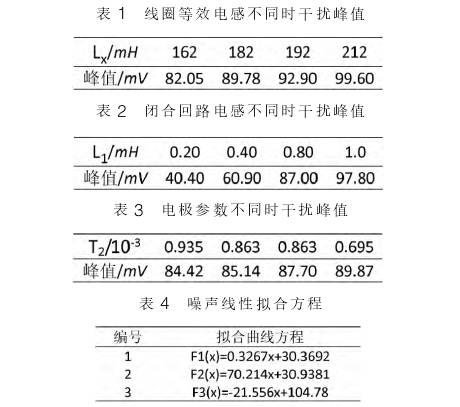 仿真(zhen)試驗(yan)中,設(she)定線(xian)圈等(deng)效電(dian)感取(qu)值範(fan)圍爲(wei)162~212mH,間隔(ge)10mH;閉合(he)回路(lu)等效(xiao)電感(gan)範圍(wei)0.2~1mH,間隔(ge)爲0.2mH;雙(shuang)電層(ceng)電容(rong)、接觸(chu)電阻(zu)随流(liu)體電(dian)📧導率(lü)💛變化(hua)而變(bian)化,電(dian)導率(lü)增大(da)接觸(chu)電阻(zu)和雙(shuang)電層(ceng)電容(rong)減小(xiao)而電(dian)荷傳(chuan)遞電(dian)阻增(zeng)大。可(ke)設定(ding)電極(ji)接觸(chu)電阻(zu)、雙電(dian)層電(dian)容和(he)電荷(he)✊傳遞(di)電阻(zu)範圍(wei)分别(bie)爲🌈5~15kΩ、10~20μF和(he)50~60Ω,由公(gong)式(7)知(zhi),可用(yong)T2表示(shi)上述(shu)三者(zhe)關系(xi)✔️。仿真(zhen)參數(shu)取值(zhi)不同(tong)情況(kuang)下,通(tong)過MATLAB工(gong)具箱(xiang)對仿(pang)🌈真測(ce)量得(de)到的(de)幹擾(rao)峰值(zhi)進行(hang)曲線(xian)拟合(he)畫出(chu)相應(ying)的曲(qu)線圖(tu)。其中(zhong)仿真(zhen)數據(ju)📱和相(xiang)對應(ying)的曲(qu)線方(fang)程如(ru)表1~表(biao)4所示(shi),曲線(xian)圖如(ru)圖4~圖(tu)6。