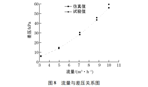 取(qu)5個不同大(da)小的流量(liang)按流速從(cong)小到大,再(zai)從大到小(xiao),反複測量(liang)🌈差壓值,測(ce)量次數爲(wei)3,測量結果(guo)取平均值(zhi)對試驗測(ce):量時得❤️到(dao)的🚩流速進(jin)行模拟仿(pang)真,并與試(shi)驗結果相(xiang)比較。由此(ci)📐可得到⭕如(ru)圖8流量與(yu)差壓關🙇♀️系(xi)圖。