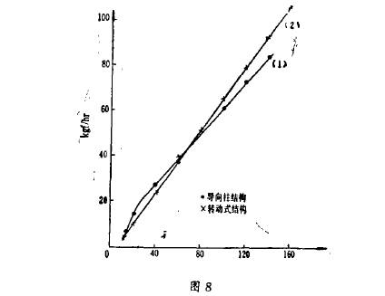 采用上(shang)述轉動式(shi)浮子流量(liang)計,在使用(yong)中取得較(jiao)滿意♉的效(xiao)果☔。圖8爲實(shi)測兩條典(dian)型的流量(liang)曲線。試驗(yan)介質:水,輸(shu)出指示:,A,浮(fu)子最大直(zhi)徑爲功7mm;錐(zhui)形管長度(du)爲40rn幻n,錐度(du)爲20:1。曲線(1)爲(wei)原來結構(gou)測得的流(liu)🔞量曲線,曲(qu)線(2)爲改進(jin)後轉動式(shi)浮子的流(liu)量計測得(de)的結果。