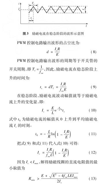 所(suo)以,爲(wei)了使(shi)基于(yu)PWM控制(zhi)的脈(mo)沖勵(li)磁系(xi)統在(zai)設定(ding)的開(kai)關頻(pin)率下(xia)正常(chang)工作(zuo),且勵(li)磁電(dian)流值(zhi)在穩(wen)态階(jie)段的(de)波動(dong)幅值(zhi)小于(yu)Imax,勵磁(ci)線圈(quan)的直(zhi)流電(dian)阻值(zhi)需要(yao)滿足(zu)式(7)和(he)式(13)所(suo)決定(ding)的範(fan)圍。