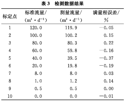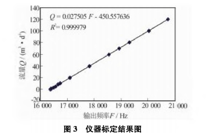 将儀器(qi)連接封隔(ge)裝置放人(ren)标定井簡(jian)中,封隔裝(zhuang)置密🌈封儀(yi)器㊙️外璧與(yu)井簡内壁(bi)形成的環(huan)形空間,保(bao)證流體完(wan)全進人🐅測(ce)量通道。給(gei)儀器供電(dian)進行流量(liang)調節,流量(liang)調節爲0.5.1.0.3.0、5.0、8.0、10.0、20.0、40.0、60.0、70.0、80.0、100.0、120.0m3/d,記(ji)錄每⭐一流(liu)量點時的(de)儀器輸出(chu)頻率,記錄(lu)時間爲2min。計(ji)算每一流(liu)量點時的(de)儀器輸出(chu)頻率平均(jun)值,将💘數據(ju)進行線性(xing)拟合,得到(dao)儀器的标(biao)定🔞檢測結(jie)果圖見圖(tu)3,儀器的檢(jian)測🥰數據結(jie)果(見表3)。由(you)圖3可見,随(sui)着⭐流量的(de)增大,儀器(qi)輸出頻率(lü)線性增加(jia),線性🌐相關(guan)系數爲0.9999979,顯(xian)示🌈出儀器(qi)具有良好(hao)‼️的線性響(xiang)應。由表3可(ke)見,在0.5~120.0m³/d流量(liang)範圍内,儀(yi)器測量誤(wu)差在±1%之❓内(nei)。