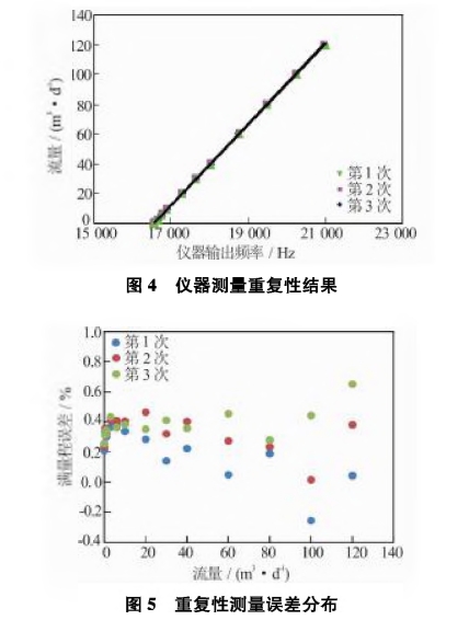 記錄每一(yi)流量點時(shi)的儀器輸(shu)出頻率,在(zai)水中進行(hang)🐪3次測量,儀(yi)器測量重(zhong)複性結果(guo)見圖4。由圖(tu)4可見,3次測(ce)量結果基(ji)本重複。計(ji)算重🧑🏾🤝🧑🏼複性(xing)誤差,對同(tong)--流量點的(de)3次測量儀(yi)器輸出頻(pin)率🎯取平均(jun)值,以各🏃♀️流(liu)量點的平(ping)均輸出頻(pin)🌍率值爲橫(heng)坐标,以流(liu)量爲縱坐(zuo)标進行線(xian)性拟合,得(de)到線性拟(ni)合結果,将(jiang)每一-次各(ge)流量點的(de)輸出頻率(lü)代人拟合(he)公式中進(jin)📐行測量流(liu)量的計算(suan),将測量的(de)流量與标(biao)準流量對(dui)比,計算滿(man)量程誤差(cha),得到誤差(cha)分布(見圖(tu)5)。最大重複(fu)性誤差爲(wei)0.65%,顯示清水(shui)中3次測量(liang)結果具有(you)良😄好的重(zhong)複性。
