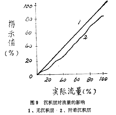 我(wo)們還未(wei)碰到過(guo)附着沉(chen)積層影(ying)響流量(liang)指示值(zhi)的實例(li),因此沒(mei)有試驗(yan)與驗證(zheng)。隻看到(dao)資料上(shang)的一個(ge)實例,發(fa)送器口(kou)徑150毫米(mi),沉積層(ceng)厚度3毫(hao)米,有無(wu)沉積層(ceng)二種惰(duo)況下流(liu)測量定(ding)值示于(yu)圖9。