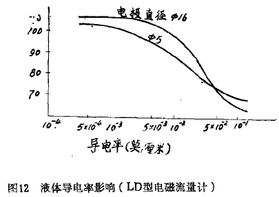 對(dui)于配有(you)EWY型電位(wei)差計(經(jing)改裝過(guo))的LD型電(dian)磁流量(liang)計老産(chan)品由于(yu)測量線(xian)路的輸(shu)入阻抗(kang)較小(Rr≈3兆(zhao)歐),當導(dao)電率超(chao)過某一(yi)數值時(shi),會降低(di)流量訊(xun)号而改(gai)變了流(liu)量指示(shi)值。我們(men)也曾用(yong)第六節(jie)所述相(xiang)同的食(shi)鹽水,對(dui)LD--25型電磁(ci)流量計(ji)老産品(pin)做試驗(yan),試驗表(biao)明有一(yi)定影響(xiang),結果示(shi)于圖12。此(ci)圖曲線(xian)隻能定(ding)性地看(kan)總的趨(qu)向,不能(neng)取作修(xiu)正系數(shu),因爲電(dian)極大小(xiao)、管徑等(deng)因素,均(jun)會影響(xiang)曲線的(de)數值,如(ru)用過去(qu)生産的(de)LD型電磁(ci)流量計(ji)老産品(pin),液體導(dao)電率影(ying)響流量(liang)指示值(zhi)時,有時(shi)候可以(yi)利用現(xian)場設備(bei)重新标(biao)定,下面(mian)介紹利(li)用現場(chang)設備,實(shi)際使用(yong)液體重(zhong)新标定(ding)的一個(ge)實例: