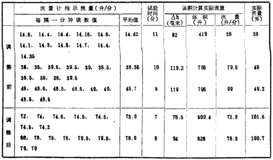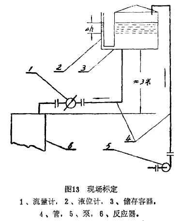 某(mou)化肥廠(chang)用LD--25型電(dian)磁流量(liang)計測量(liang)濃硫酸(suan),管道系(xi)統與容(rong)器設備(bei)如圖18所(suo)示。流量(liang)計的.上(shang)遊有園(yuan)形容器(qi)3,高出儀(yi)表3米,靠(kao)液體的(de)位能推(tui)動液流(liu)。用鋼卷(juan)尺測出(chu)容器尺(chi)寸,每厘(li)米高度(du)h的體積(ji)爲66.58升,酸(suan)從泵5定(ding)期打入(ru)從底部(bu)流出。試(shi)驗時二(er)人同在(zai)同一時(shi)間内讀(du)取流量(liang)計指示(shi)流量與(yu)容器液(ye)體高度(du)變化△h,求(qiu)得流過(guo)儀表的(de)實際流(liu)量。假使(shi)流量不(bu)穩定,流(liu)量計指(zhi)示值變(bian)動或波(bo)動較大(da),可以根(gen)據情況(kuang)每隔一(yi)段時間(jian)(譬如15秒(miao)、30秒或1分(fen))讀取一(yi)個數值(zhi),計算時(shi)取它們(men)的平均(jun)值。用硫(liu)酸标定(ding)的流量(liang)值與在(zai)制造廠(chang)用水标(biao)定.的流(liu)量值進(jin)行比較(jiao),根據試(shi)驗結果(guo)求得的(de)差值,調(diao)換電位(wei)差計中(zhong)的平衡(heng)訊号發(fa)生器(使(shi)用說明(ming)書中圖(tu)六之4)中(zhong)的電阻(zu)R:(使用說(shuo)明書中(zhong)圖十六(liu))的阻值(zhi)(用錳銅(tong)絲繞制(zhi)),再用硫(liu)酸校驗(yan)一次,以(yi)達到準(zhun)的确流(liu)量指示(shi)值。試驗(yan)結果見(jian)表一。.