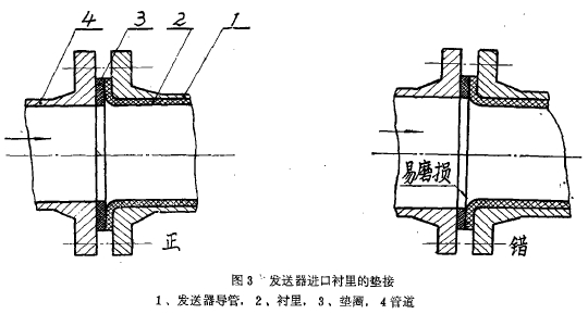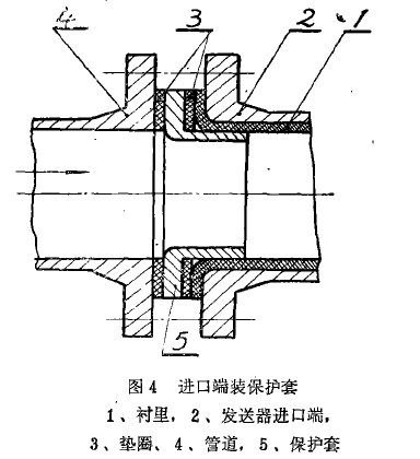 發送器(qi)接上管(guan)道時,進(jin)口端要(yao)避免如(ru)圖3B所示(shi)錯誤的(de)裝法,襯(chen)裏口暴(bao)露在液(ye)流之中(zhong),使襯裏(li)磨耗極(ji)快,使用(yong)日久,磨(mo)損漸向(xiang)内伸,緻(zhi)使襯裏(li)全部破(po)壞。如按(an)A的方式(shi)就比較(jiao)好些。有(you)一使用(yong)單位曾(ceng)在發送(song)器進口(kou)端裝一(yi)~金屬保(bao)護套,如(ru)圖4所示(shi),先使金(jin)屬保護(hu)套抵擋(dang)-層,使勿(wu)傷襯裏(li),定期掉(diao)換,有一(yi)定效果(guo)。如果該(gai)保護套(tao)采用耐(nai)磨性好(hao)上數十(shi)倍的鑄(zhu)石制作(zuo),那麽防(fang)磨損的(de)保護作(zuo)用就更(geng)爲理想(xiang)了。假如(ru)發送器(qi)導管的(de)襯裏全(quan)部用鑄(zhu)石制造(zao),那末耐(nai)磨問題(ti)可以說(shuo)完全解(jie)決了,但(dan)是目前(qian)制作上(shang)還有一(yi)定困難(nan),希望大(da)家一起(qi)想想辦(ban)法。