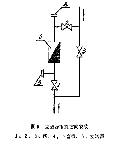 在測(ce)量礦槳(jiang)流量時(shi),除了上(shang)述要求(qiu)耐磨以(yi)外,還有(you)一個在(zai)電極與(yu)村裏結(jie)垢粕(如(ru)碳酸鈣(gai)、硫酸鈣(gai)等)的麻(ma)煩事情(qing)。現在還(hai)沒有想(xiang)到怎樣(yang)避免的(de)好辦法(fa)。隻能提(ti)出勤清(qing)洗的方(fang)法來解(jie)決,建議(yi)如圖5所(suo)示管系(xi)安裝發(fa)送器,清(qing)洗時比(bi)較方便(bian)些。清洗(xi)時關掉(diao)閥1、2,開閥(fa)3勿使液(ye)流中斷(duan)影響正(zheng)常生産(chan),再卸下(xia)盲闆4、5就(jiu)可進行(hang)清洗了(le)。
