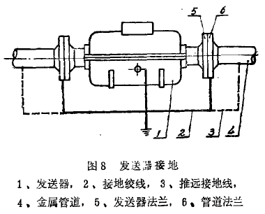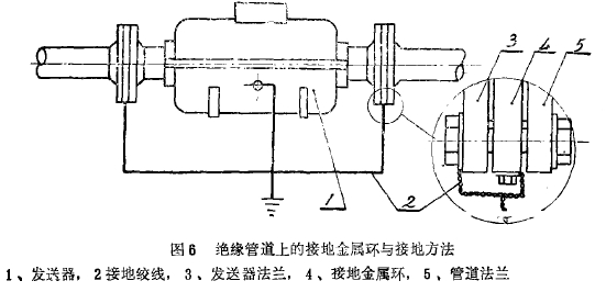 在化工(gong)行業中(zhong)輸送腐(fu)蝕性液(ye)體的管(guan)道系統(tong),往往采(cai)用塑料(liao),玻璃等(deng)不導電(dian)材料的(de)管系,液(ye)體在這(zhe)種管道(dao)中流動(dong),處于對(dui)地絕緣(yuan)狀态,斷(duan)絕了介(jie)質接地(di)的參考(kao)電位,使(shi)儀表無(wu)法正常(chang)工作。因(yin)此爲了(le)使流動(dong)液體良(liang)好接地(di),必須如(ru)圖6所示(shi)在發送(song)器前後(hou)各接一(yi)個接地(di)金屬環(huan)或--小段(duan)金屬管(guan),使發送(song)器前後(hou)二段的(de)液體接(jie)地,以排(pai)除幹擾(rao)。這方面(mian)的教訓(xun)是很多(duo)的,下文(wen)第3一3節(jie)還有較(jiao)詳細的(de)說明。