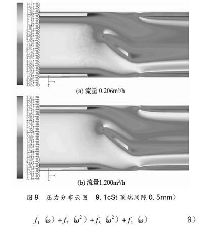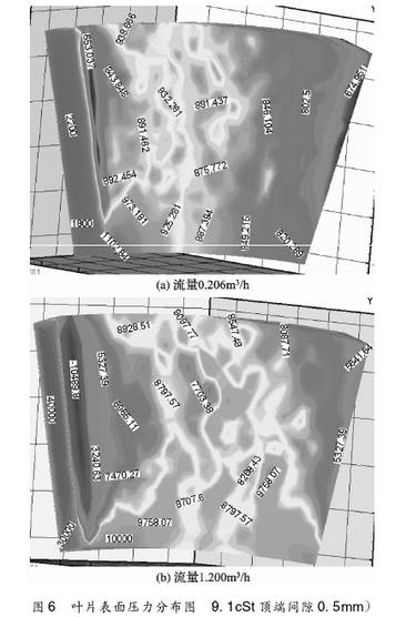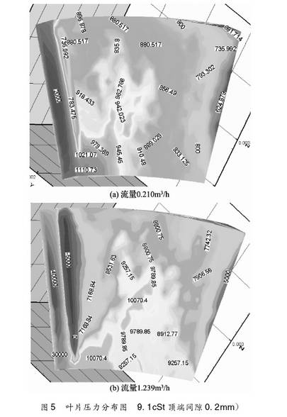 比(bi)較圖(tu)5(a)和圖(tu)5(b)、圖6中(zhong)的圖(tu)6(a)和圖(tu)6(b),可以(yi)看出(chu),對于(yu)相同(tong)粘度(du)的流(liu)體,随(sui)着流(liu)量的(de)增大(da),高壓(ya)區的(de)面積(ji)變大(da),且向(xiang)葉片(pian)的⁉️尾(wei)部和(he)頂端(duan)移動(dong),緻使(shi)葉片(pian)所受(shou)驅動(dong)力矩(ju)增加(jia),葉輪(lun)旋轉(zhuan)角速(su)度增(zeng)大。對(dui)于相(xiang)同粘(zhan)度的(de)流體(ti)在相(xiang)同的(de)流量(liang)點處(chu),頂端(duan)間隙(xi)由0.2mm增(zeng)大至(zhi)0.5mm時,比(bi)較🏒圖(tu)5和圖(tu)6可以(yi)看出(chu),葉片(pian)表面(mian)的高(gao)壓區(qu)面積(ji)變大(da),且向(xiang)葉片(pian)的尾(wei)部⚽和(he)頂端(duan)移動(dong),緻使(shi)葉輪(lun)所受(shou)驅動(dong)力矩(ju)增加(jia),而由(you)圖7和(he)圖8可(ke)以看(kan)出葉(ye)片尾(wei)部的(de)低壓(ya)區面(mian)🤟積變(bian)小,葉(ye)輪旋(xuan)轉的(de)阻力(li)減小(xiao),則旋(xuan)轉⚽的(de)角速(su)度👌增(zeng)大,即(ji)儀表(biao)系數(shu)增大(da)🔞。