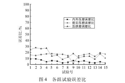 對于雙向(xiang)内外管壓(ya)差流量計(ji)而言,内外(wai)壓差信号(hao)大的條件(jian)下💛,壓損越(yue)小越好,故(gu)選取内外(wai)壓差信号(hao)🔞與壓損的(de)差值,即壓(ya)🔅損差,作爲(wei)雙向内外(wai)管壓差流(liu)量計的評(ping)價指标。按(an)照前文設(she)置的結構(gou)參數建立(li)15組三維模(mo)🏒型,分别利(li)🆚用FLUENT與COMSOL進行(hang)仿真,根據(ju)仿真結果(guo),記錄内外(wai)壓差信号(hao),将COMSOL和FLUENT仿真(zhen)數據的差(cha)的絕對值(zhi)與FLUENT數據的(de)比值定義(yi)爲誤差比(bi),内外壓差(cha)信号數據(ju)對比見表(biao)2,用同樣的(de)方法💃🏻記錄(lu)兩種軟件(jian)仿真結果(guo)的前後壓(ya)損和壓損(sun)✍️差,并計算(suan)出誤差比(bi),數據對比(bi)☁️見表3、表4。繪(hui)制的誤差(cha)比折線圖(tu)如圖4所示(shi)。